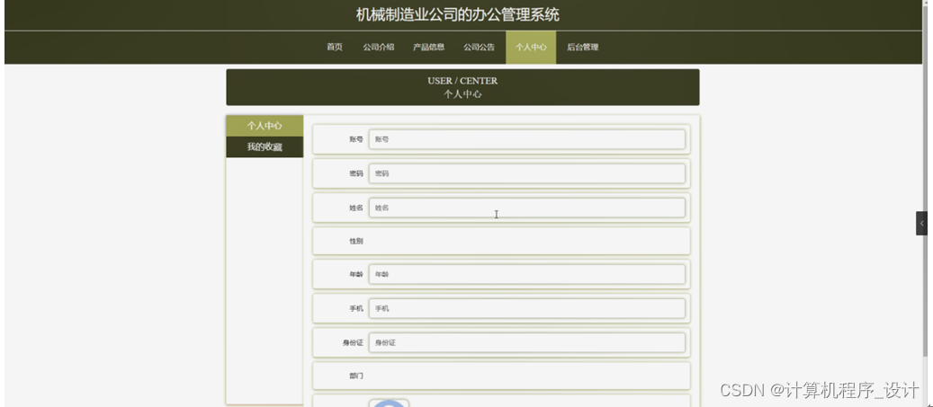 个人中心,在个人中心页面通过填写账号,密码,姓名,性别,年龄,手机,身份证,部门,上传图片等内容进行信息更新操作,还可以根据需要对我的收藏进行详细操作;如图5-4所示。