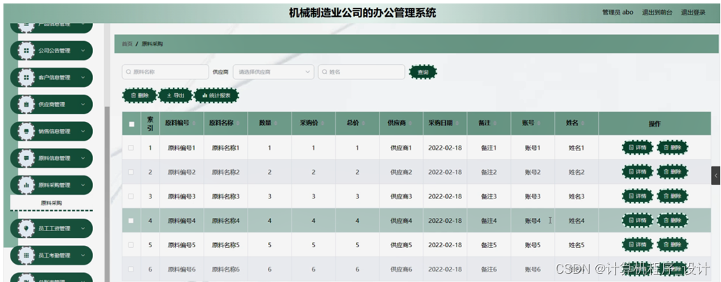 原料采购管理,在原料采购管理页面可以对索引,原料编号,原料名称,数量,采购价,总价,供应商,采购日期,备注,账号,姓名等内容进行详情和删除等操作,如图5-11所示。