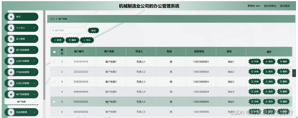 客户信息管理,在客户信息管理页面可以对索引,编号,客户名称,负责人,性别,联系电话,地址等内容进行详情,修改或删除等操作,如图5-8所示。
