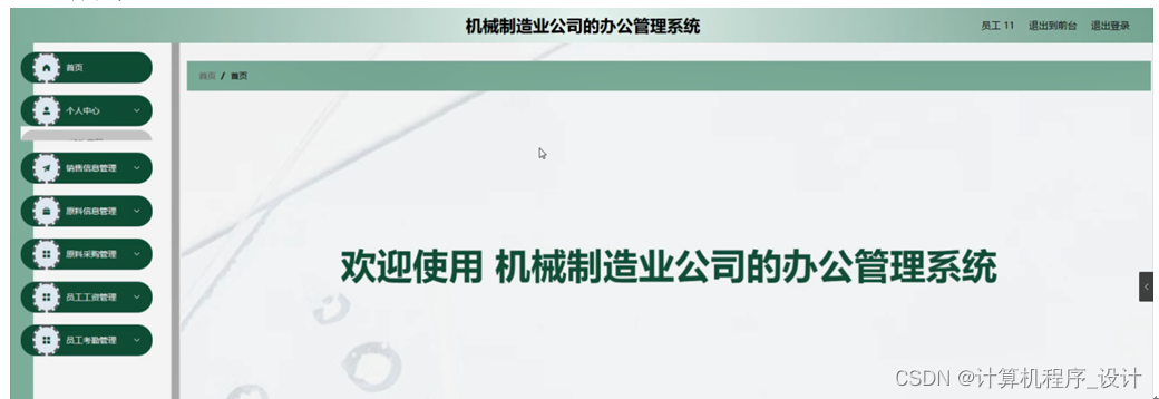 员工登录进入机械制造业公司的办公管理系统可以查看首页,个人中心,销售信息管理,原料信息管理,原料采购管理,员工工资管理,员工考勤管理等内容进行详细操作,如图5-13所示。