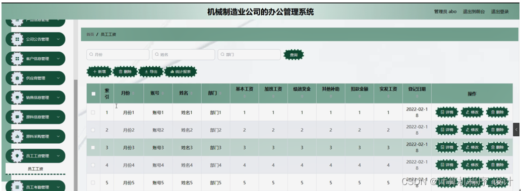 员工工资管理,在员工工资管理页面可以对索引,月份,账号,姓名,部门,基本工资,加班工资,绩效资金,其他补助,扣款金额,实发工资,登记日期等内容进行详情、修改或删除等操作,如图5-12所示。