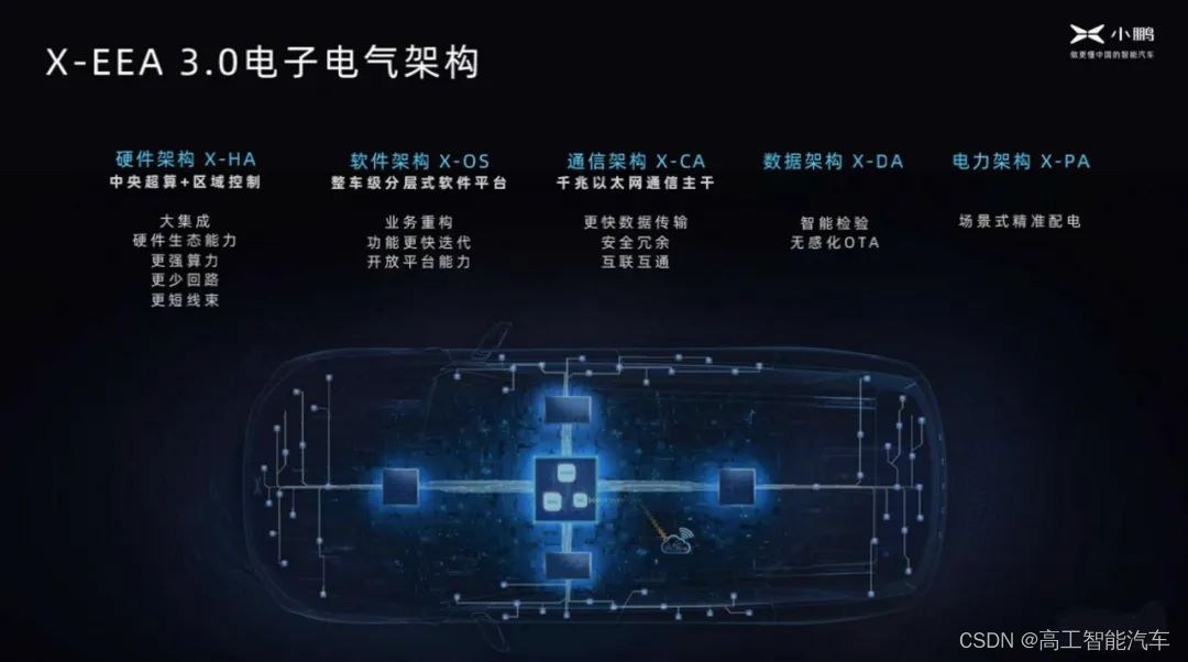 而领先一步量产的小鹏G9基于X-EEA 3.0 架构,采用的中央计算+区域架构,通信架构采用千兆以太网通信,预示着电子电气架构来到了第三个阶段。