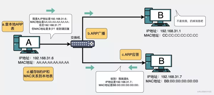 2.看下 192.168.31.7 跟本机IP 192.168.31.6在不在一个局域网下。如果在的话,就在局域网内发一个 arp 广播,内容就是 前面提到的 “谁是 192.168.31.7,告诉一下 192.168.31.6”。