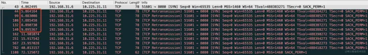 最后留个问题,连一个 不存在的局域网外IP的主机时,我们可以看到TCP的重发规律是:开始时,每隔1s重发五次 TCP SYN消息,接着2s,4s,8s,16s,32s都重发一次;