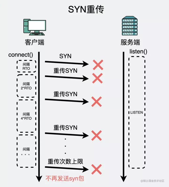 此时 因为 TCP 协议是可靠的协议,对于 TCP 层来说,第一次握手的消息,已经发出去了,但是一直没有收到 ACK。也不知道消息是出去后是遇到什么事了。为了保证可靠性,它会不断重发。