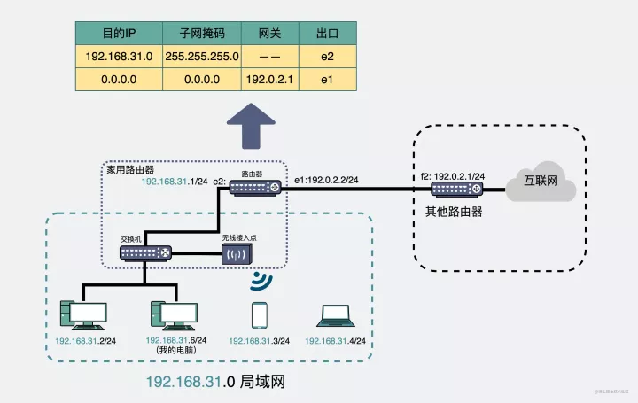 符合这个形式的这些个设备,本质上就是通过各种设备(wifi或交换机等)接入到上图路由器的e2端口,他们共同构成一个局域网。