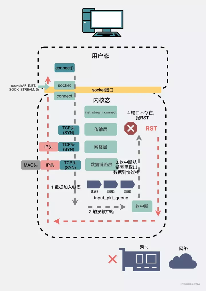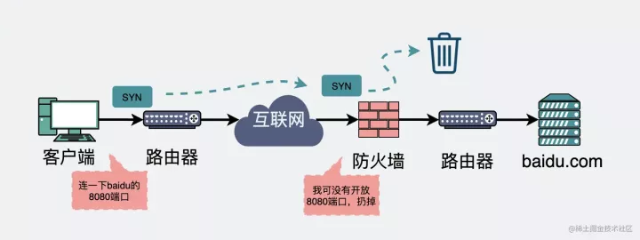 直到传输层,TCP协议在识别到这个端口号对应的进程根本不存在时,就会把数据丢弃,响应一个RST消息给发送端。