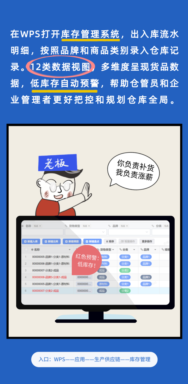 在WPS打开库存管理系统,出入库流水明细,按照品牌和商品类别录入仓库记录,12类数据视图,多维度呈现货品数据,低库存自动预警,帮助仓库员和企业管理者更好把控和规划仓库全局。