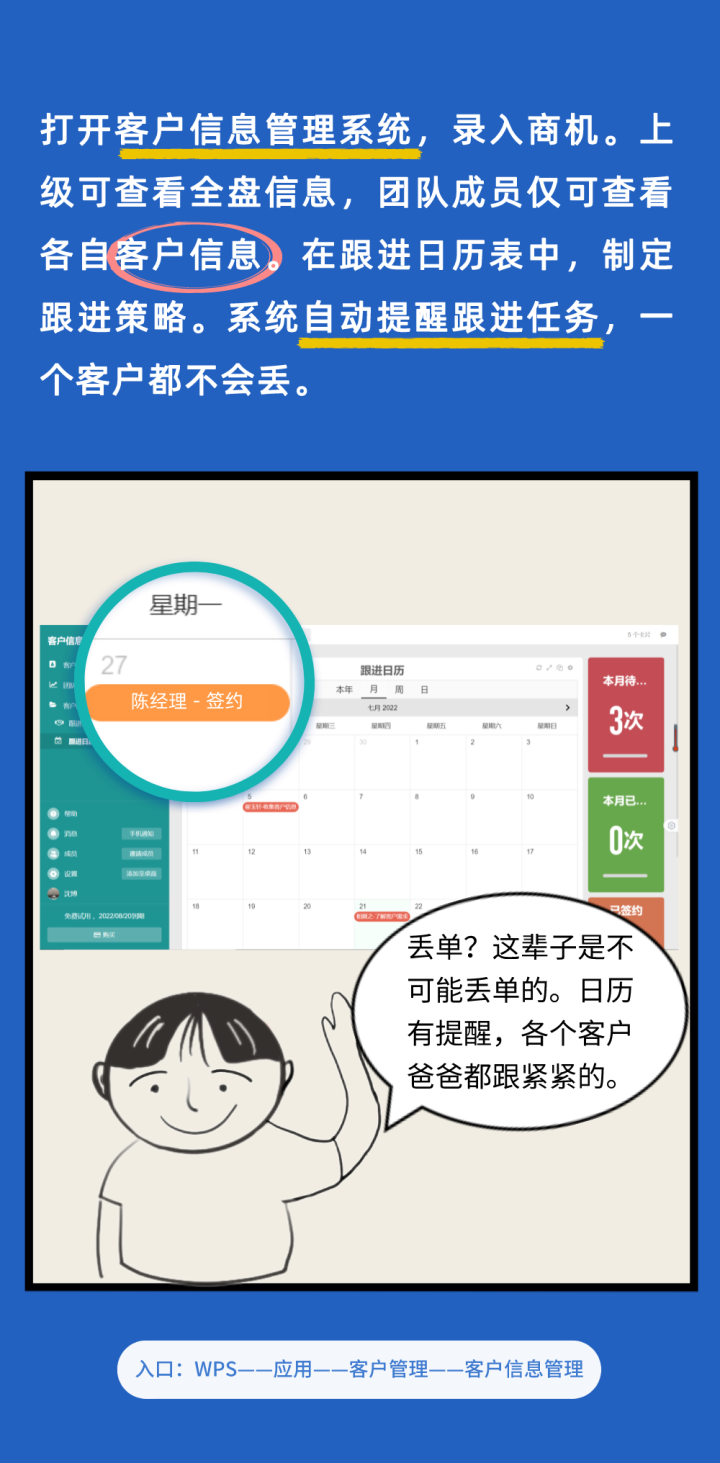 打开客户信息管理系统,录入商机。上级可查看全盘信息,团队成员仅可查看各自客户信息。在跟进日历表中,制定跟进策略。系统自助提醒跟进任务,一个客户都不会丢。