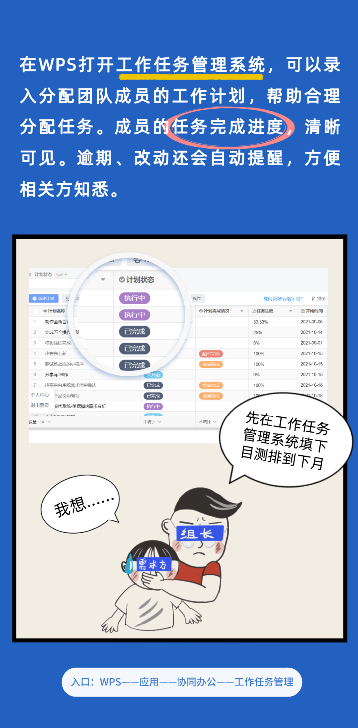 在wps打开工作任务管理系统,可以录入分配团队成员的工作计划,帮助合理分配任务。成员的任务完成进度,清晰可见。逾期、改动还会自动提醒,方便相关方知悉。