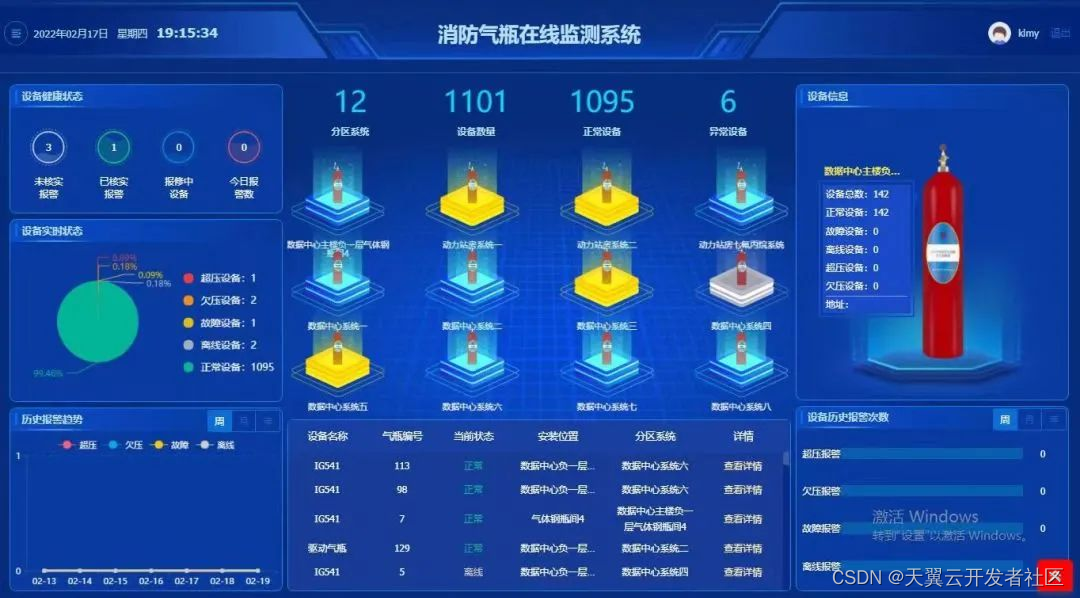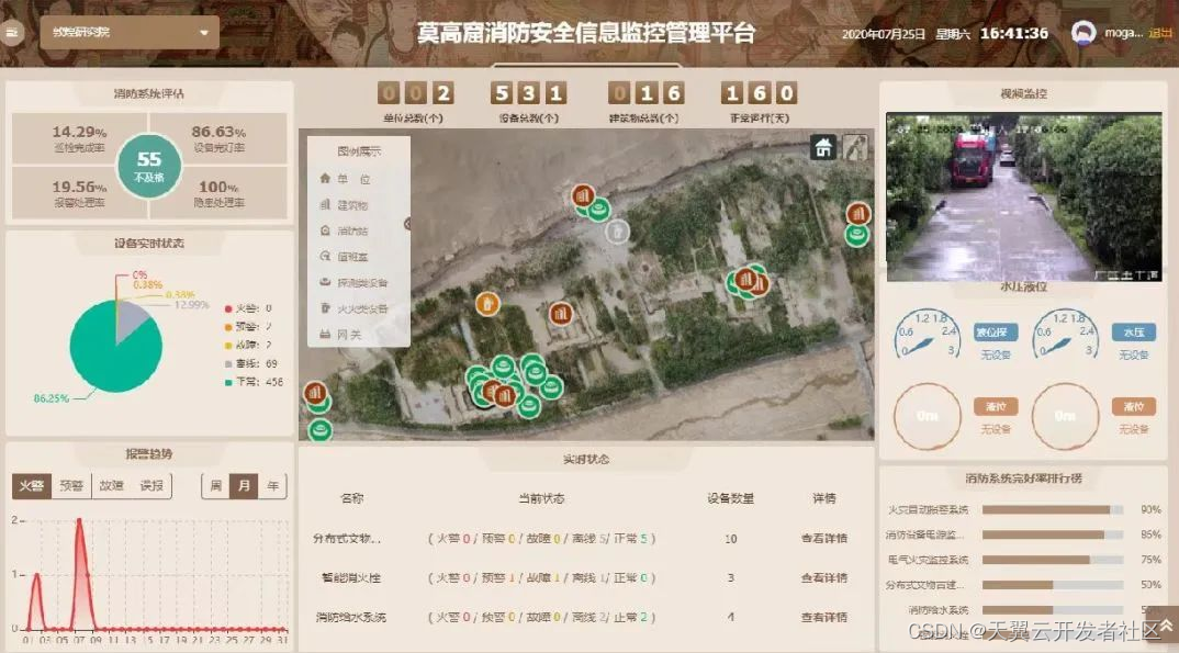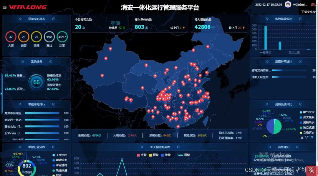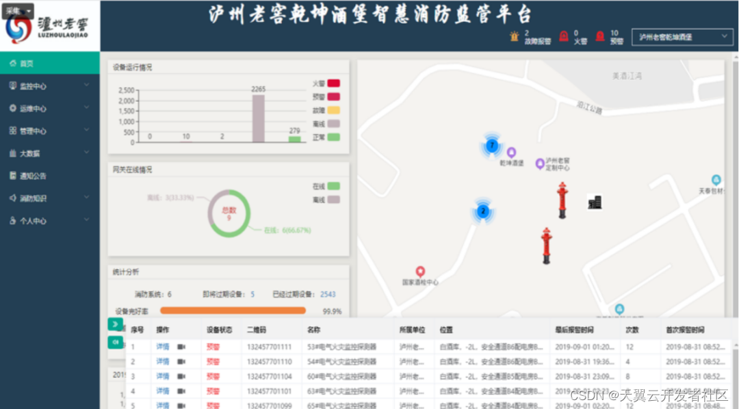 该平台借助云计算、大数据、物联网技术,实现对城市消防自动报警系统、电气火灾监控系统、可燃气体监测报警设备、专业消防灭火设备、AI视频监控、环境监控系统、光纤传感器等多种数据的采集及应用分析。