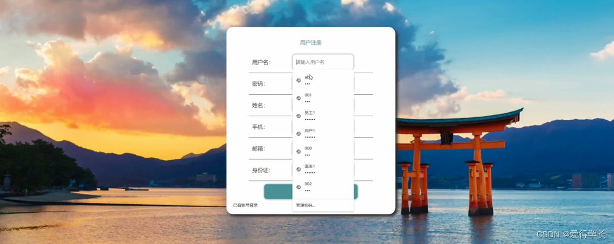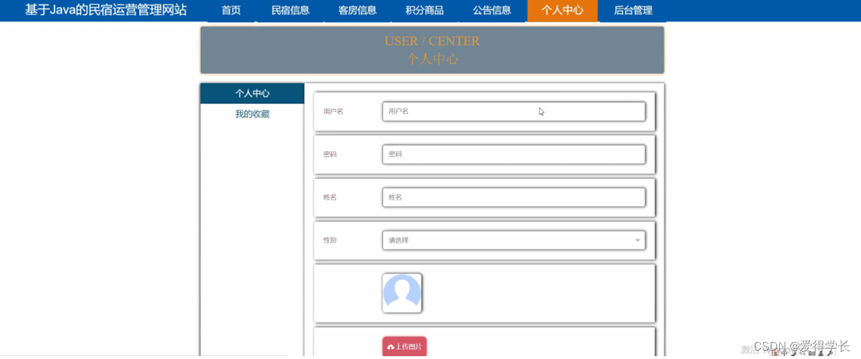用户注册,在用户注册页面通过填写用户名、密码、姓名、手机、邮箱、身份证等信息完成用户注册,如图5-5所示。在个人中心页面通过填写用户名、密码、姓名、性别、图片、手机、邮箱、身份证等信息进行个人信息修改操作,还可以根据需要对我的收藏进行详细操作;如图5-6所示。