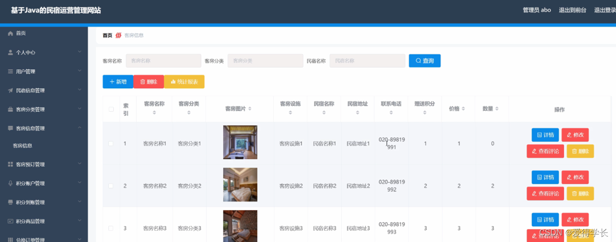 客房信息管理,在客房信息管理页面中可以查看索引、客房名称、客房分类、客房图片、客房设施、民宿名称、民宿地址、联系电话、赠送积分、价格、数量等信息,并可根据需要进行详情、修改、查看评论或删除等操作,如图5-11所示。