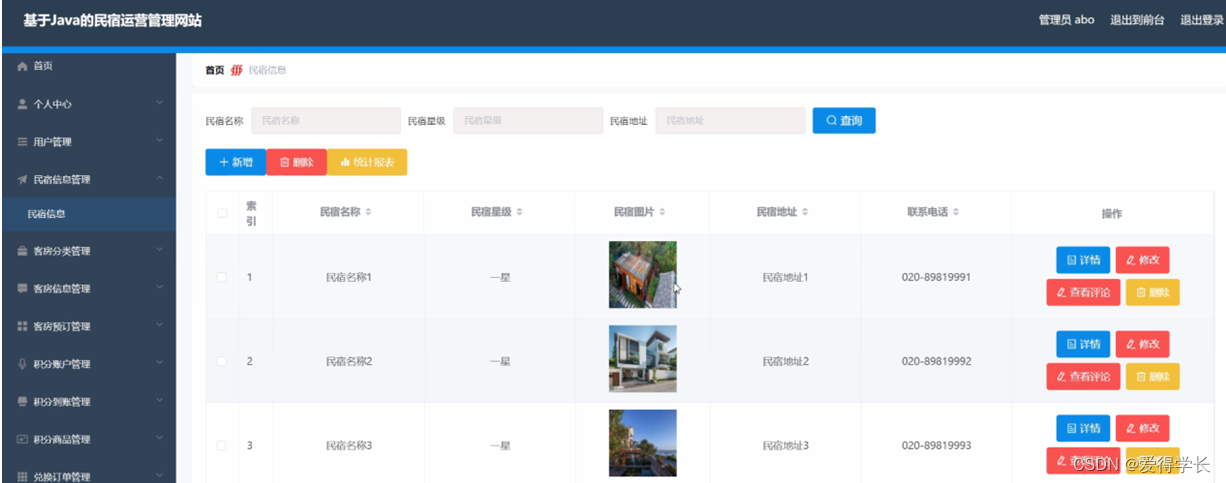 民宿信息管理,在民宿信息管理页面中可以查看索引、民宿名称、民宿星级、民宿图片、民宿地址、联系电话等信息,并可根据需要进行详情、修改、查看评论或删除等操作,如图5-10所示。