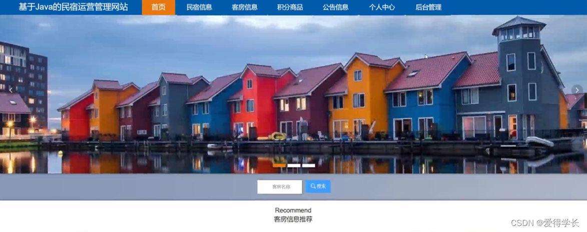 民宿运营管理网站,在系统首页可以查看首页、民宿信息、客房信息、积分商品、公告信息、个人中心、后台管理等内容进行详细操作,如图5-1所示。