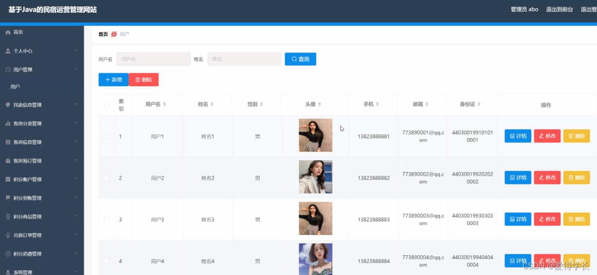 用户管理,在用户信息管理页面中可以查看索引、用户名、姓名、性别、头像、手机、邮箱、身份证等信息,并可根据需要进行详情,修改或删除等操作,如图5-9所示。