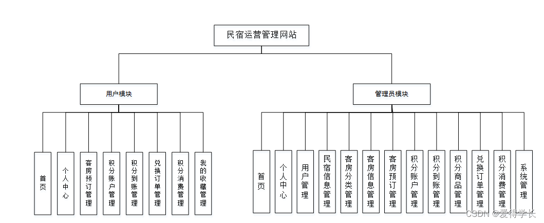 系统架构图属于系统设计阶段,系统架构图只是这个阶段一个产物,系统的总体架构决定了整个系统的模式,是系统的基础。民宿运营管理网站的整体结构设计如图4-2所示。