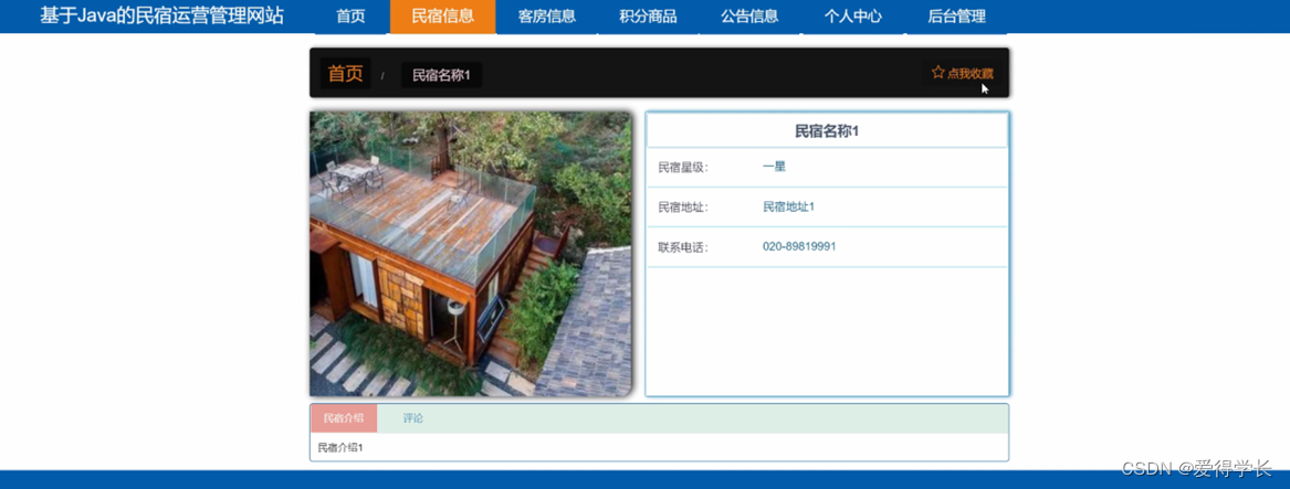 民宿信息,在民宿信息页面可以查看民宿名称、民宿星级、民宿地址、联系电话、民宿图片、民宿介绍等详细内容进行评论或收藏,如图5-2所示。