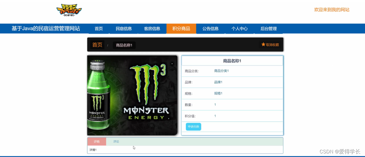 积分商品,在积分商品页面可以查看商品名称、商品分类、品牌、图片、规格、数量、积分值、详情等详细内容进行申请兑换,评论或收藏,如图5-4所示。