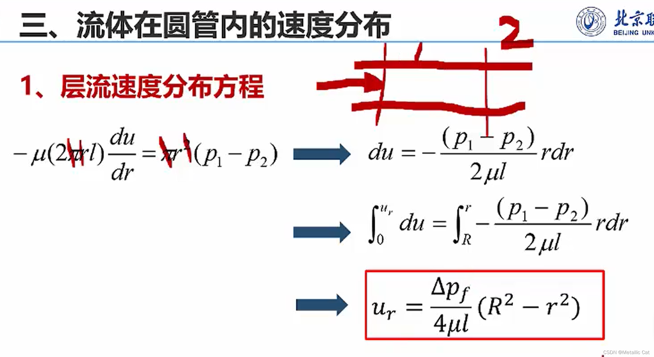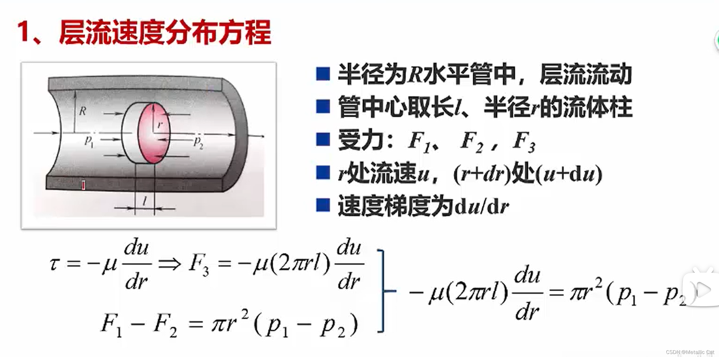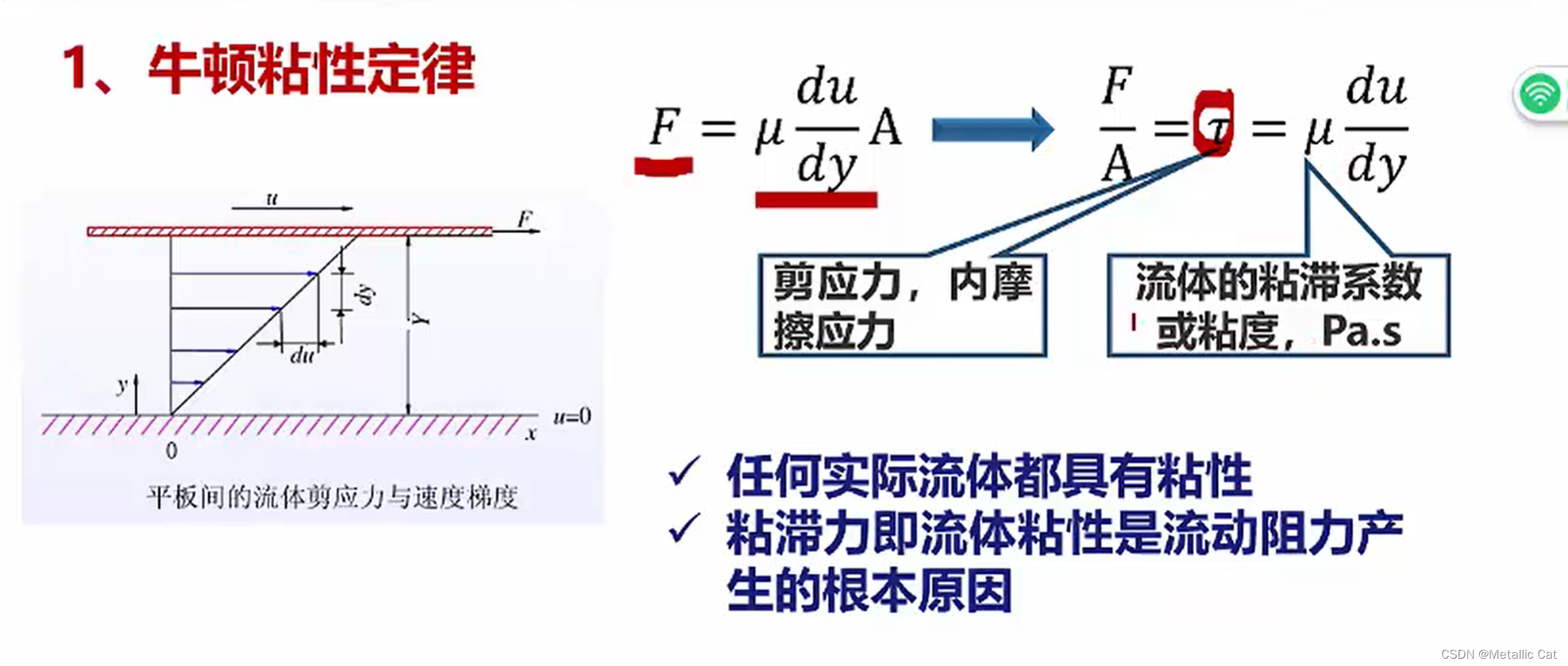 4.同时又由于流体具有粘度,在流体运动的时候它与周围的流体之间还会产生摩擦力(阻碍流体运动) --- 做层流流动的时候流体符合牛顿粘性定律,所以可以以上面这种方式写出流体受到的粘性阻力