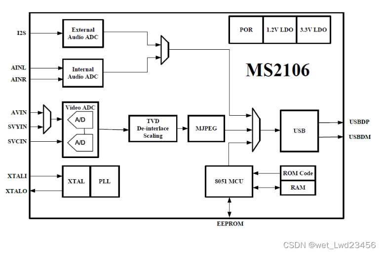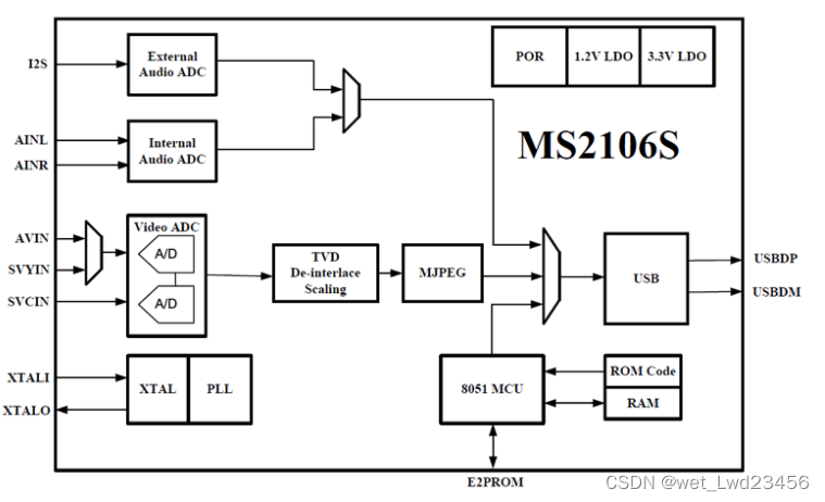 MS2106S是一款视频和音频的处理芯片,可将AV&S-Video视频信号、音频信号转换为USB信号,且转换的USB视频、音频信号符合UVC和UAC协议。同时,可通过USB接口播放或者录制视频、音频信号。MS2106S支持YUV和MJPEG两种模式。内置MCU,采用内部ROM程序,无需安装驱动,便于使用。