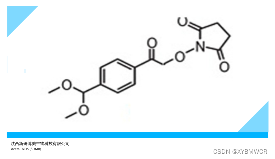 缩醛-NHS是一种短连接剂,不含提供缩醛和NHS官能团的聚乙二醇。SDMB是这个短连接器acetal-NHS的简称。SDMB代表琥珀酰亚胺基4(二甲氧基甲基)苯甲酸酯。