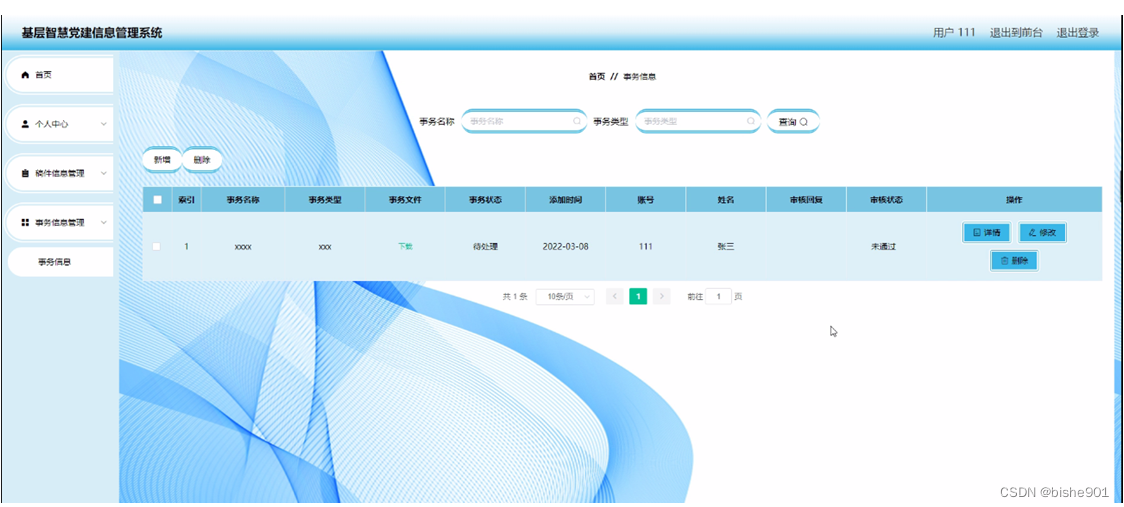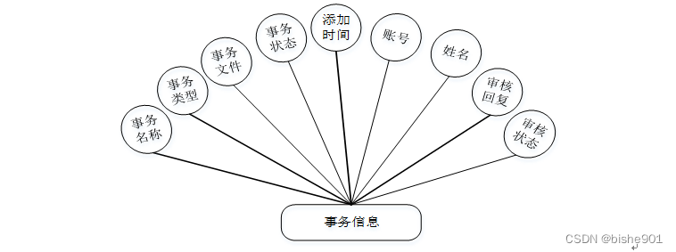 事务信息管理,用户可在事务信息管理页面查看事务名称、事务类型、事务文件、事务状态、添加时间、账号、姓名、审核回复、审核状态等内容,还可进行新增、修改或删除等操作,如图5-8所示。