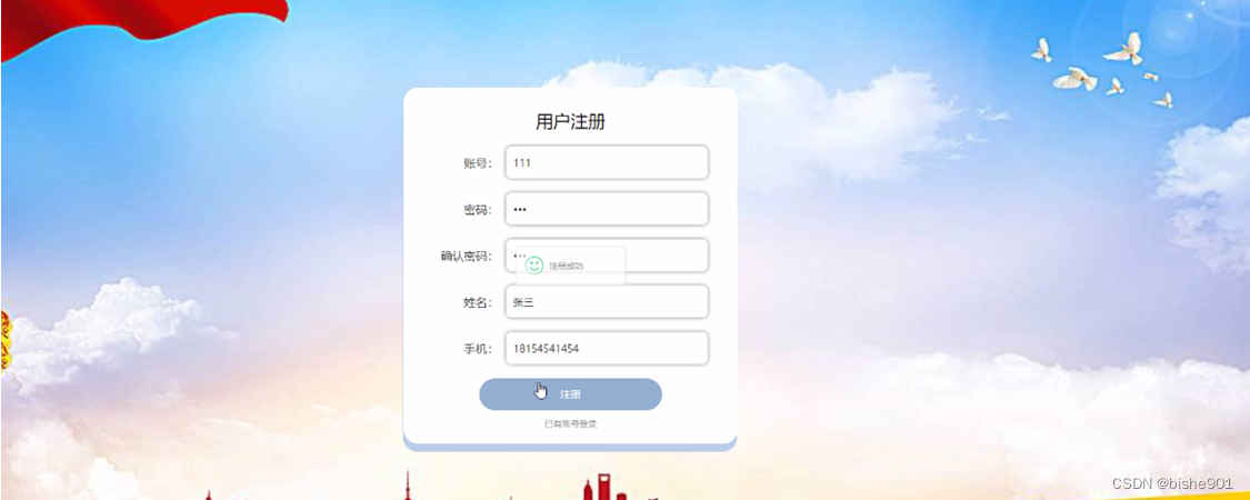 用户注册,用户通过输入账号、密码、姓名、手机进行注册,如图5-2所示。