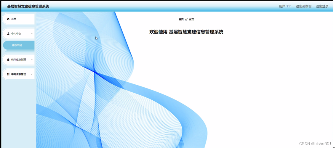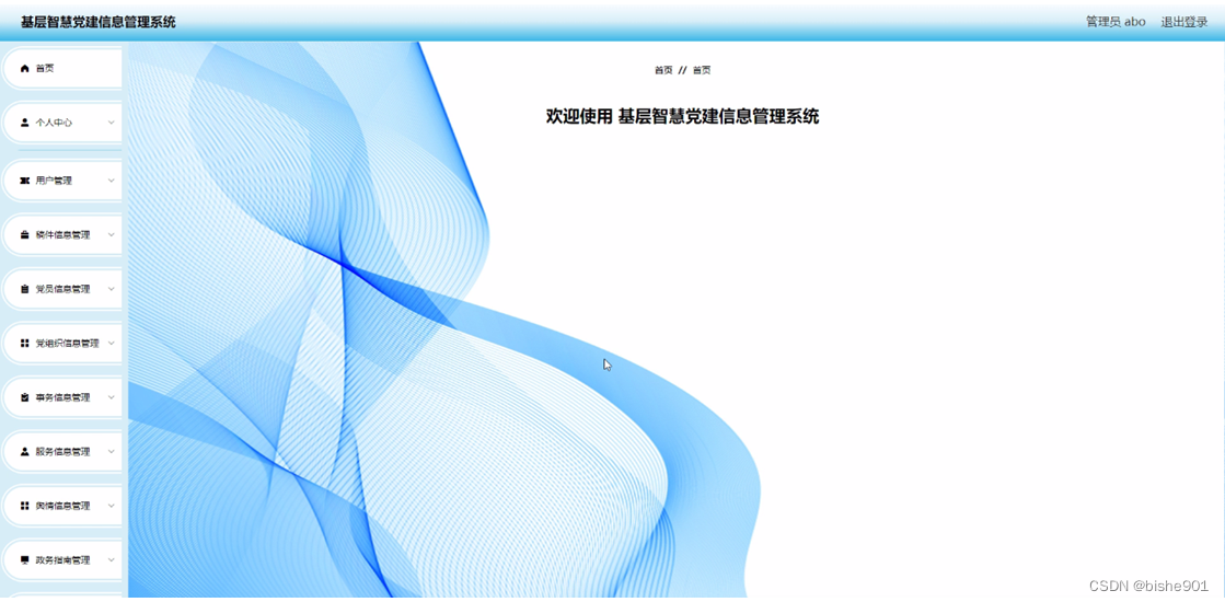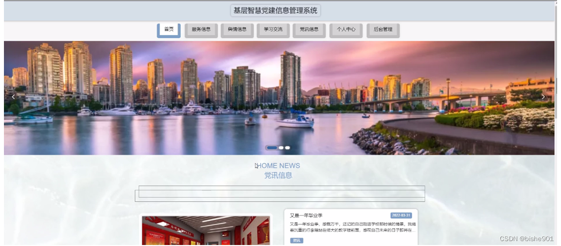 基层智慧党建信息管理系统,在系统首页可查看首页、服务信息、舆情信息、学习交流、党讯信息、个人中心、后台管理等内容,如图5-1所示。