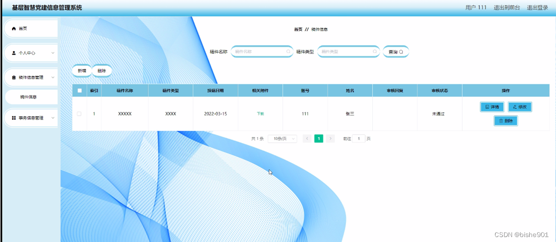 稿件信息管理,用户可在稿件信息管理页面查看稿件名称、稿件类型、投稿日期、相关附件、账号、姓名、审核回复、审核状态等内容,还可进行新增、修改或删除等操作,如图5-7所示。
