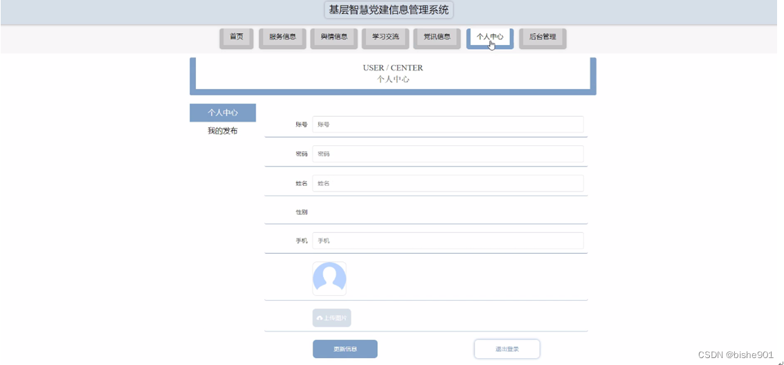 个人中心,用户可在个人中心页面通过输入账号、密码、姓名、性别、手机、上传图片进行更新信息或查看我的发布等内容,如图5-5所示。