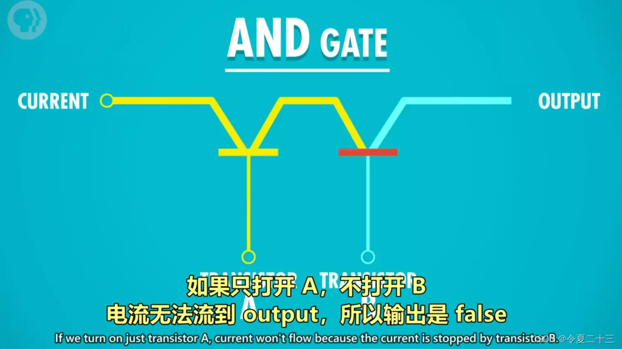 串联两个晶体管,仅当 2 个晶体管都通电,输出才有电流(True)