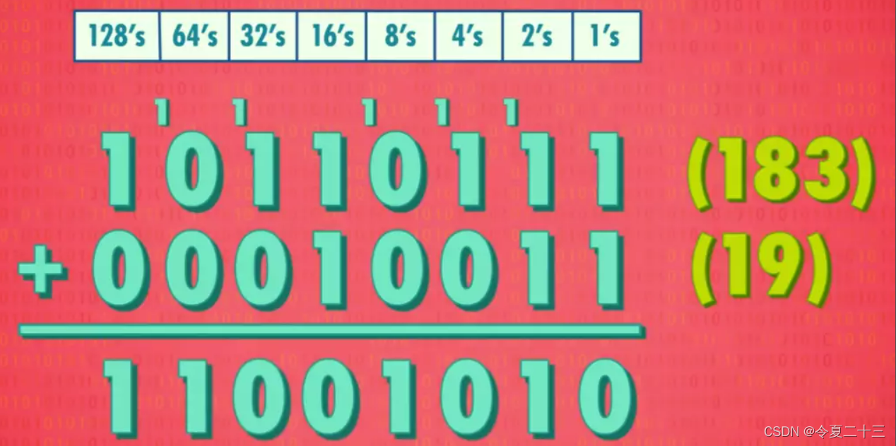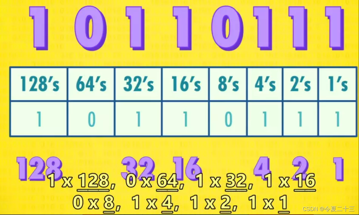 - 二进制有 2 个数字,0-1,逢 2 进 1,(不存在 2 这个数字),则每向左进一位,数字大 2 倍。