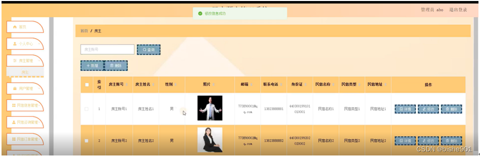 房主管理;在房主管理页面可以对用索引,房主账号,房主姓名,性别,照片,邮箱,联系电话,身份证,民宿名称,民宿类型,民宿地址等内容进行详情,修改和删除等操作,如图5-7所示。