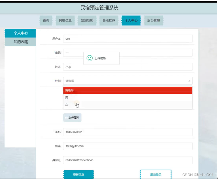 个人中心;在个人中心页面通过填写用户名,密码,姓名,性别,上传图片,手机,邮箱,身份证等信息进行更新操作,还可以对我的收藏进行相应操作,如图5-5所示。