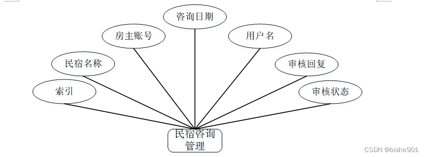 民宿咨询管理实体包括索引,民宿名称,房主账号,咨询日期,用户名,审核回复,审核状态等属性;民宿咨询管理实体图如图4-3所示: