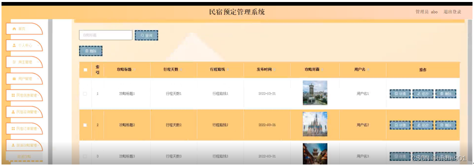 旅游攻略管理;在旅游攻略管理页面可以对索引,攻略标题,行程天数,行程路线,发布时间,攻略封面,用户名等内容进行详情,修改和删除等操作,如图5-12所示。