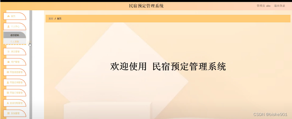管理员登录系统后,可以对首页,个人中心,房主管理,用户管理,民宿信息管理,民宿咨询管理,民宿订单管理,旅游攻略管理,系统管理等功能进行相应操作,如图5-6所示。