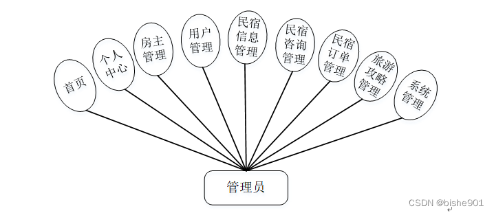 (4)管理员通过系统对可以实现网站系统管理,主要包括首页,个人中心,房主管理,用户管理,民宿信息管理,民宿咨询管理,民宿订单管理,旅游攻略管理,系统管理等功能。管理员模块用例图如图3-4所示。