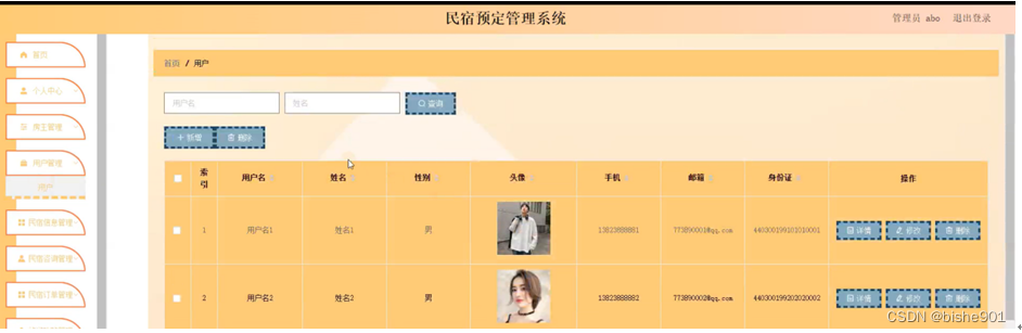 用户管理;在用户管理页面可以对索引,用户名,姓名,性别,头像,手机,邮箱,身份证等内容进行详情,修改和删除等操作,如图5-8所示。