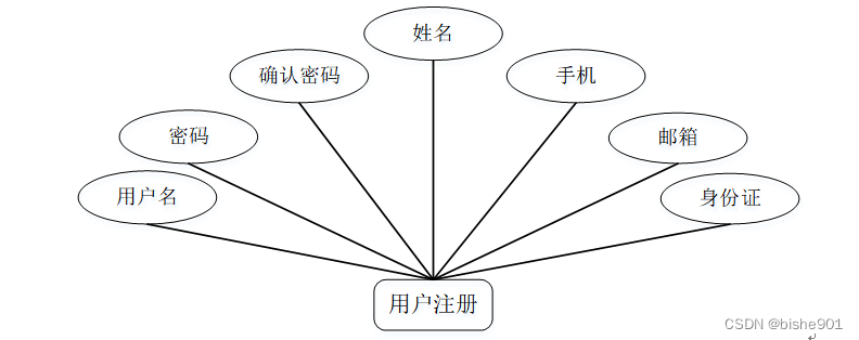 用户注册信息实体包括用户名,密码,确认密码,姓名,手机,邮箱,身份证等属性。用户注册信息实体图如图4-2所示: