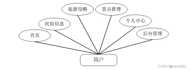 (2)用户模块主要包括首页,民宿信息,旅游攻略,景点推荐,个人中心,后台管理等功能,用户模块用例图如图3-2所示。
