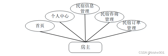 (3)房主模块主要包括首页,个人中心,民宿信息管理,民宿咨询管理,民宿订单管理等功能,房主模块用例图如图3-2所示。