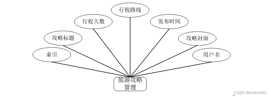 旅游攻略管理实体包括索引,攻略标题,行程天数,行程路线,发布时间,攻略封面,用户名等属性。旅游攻略管理实体图如图4-4所示: