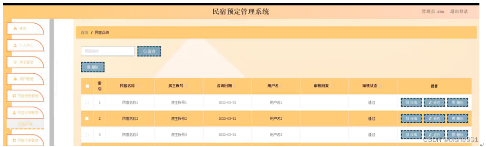 民宿咨询管理;在民宿咨询管理页面可以对索引,民宿名称,房主账号,咨询日期,用户名,审核回复,审核状态等内容进行详情,修改和删除等操作,如图5-10所示。