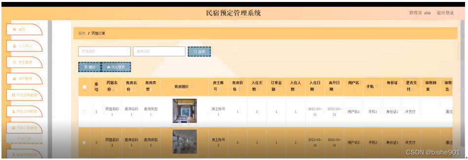 民宿订单管理;在民宿订单管理页面可以对索引,民宿名称,客房名称,客房类型,客房图片,房主账号,客房价格,入住天数,订单金额,入住人数,入住日期,离开日期,用户名,手机,身份证,是否支付,审核回复,审核状态等内容进行详情,修改和删除等操作,如图5-11所示。