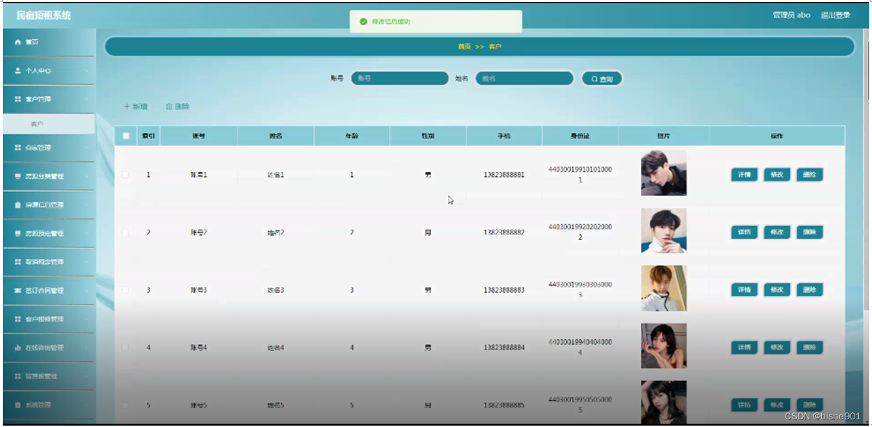 客户管理,在客户页面可以对索引,账号,姓名,年龄,性别,手机,身份证,照片等内容进行详情,修改和删除等操作,如图5-5所示。