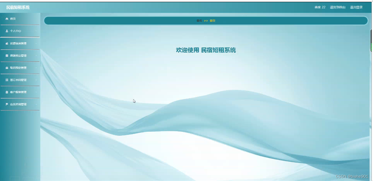 商家登录进入民宿短租系统可以对首页,个人中心,房源信息管理,房源预定管理,取消预定管理,签订合同管理,客户报修管理,在线咨询管理等功能进行相应操作,如图5-11所示。