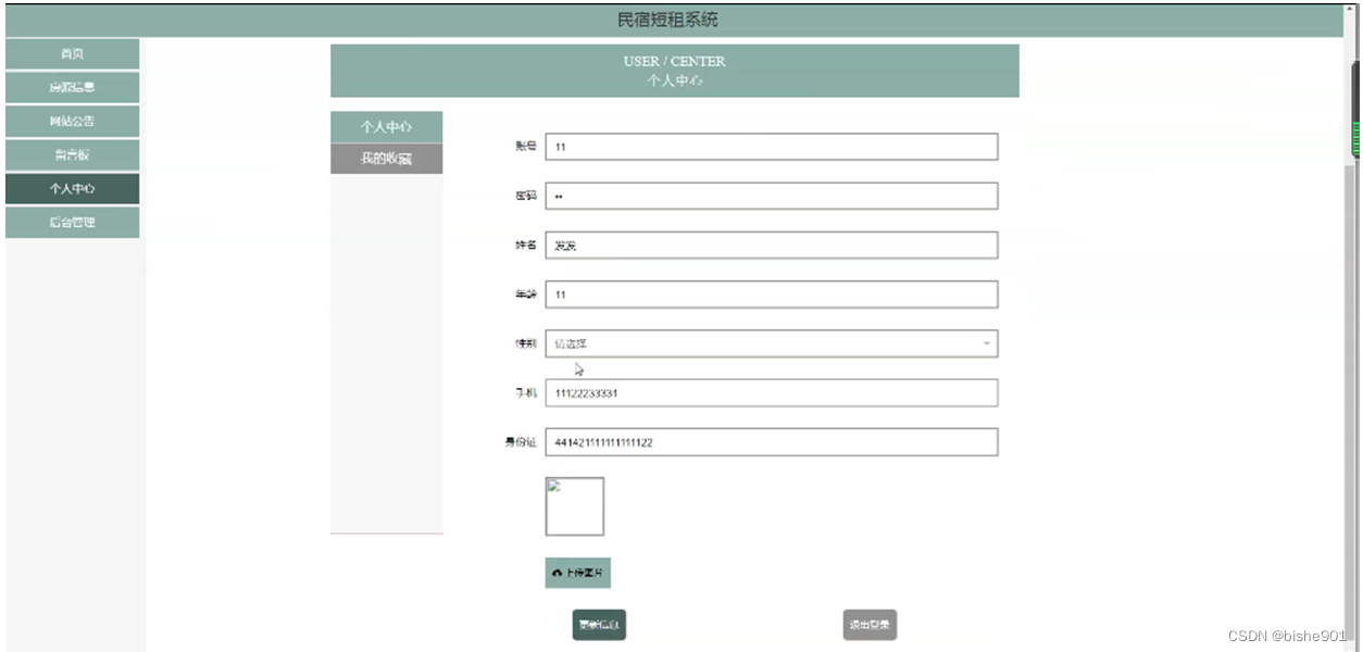 个人中心,在个人中心页面通过填写账号,密码,姓名,年龄,性别,手机,身份证,照片等信息进行更新操作,还可以对我的收藏进行详细操作;如图5-3所示。