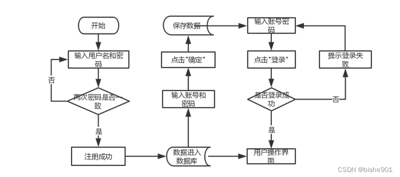 用户要通过填写自己的账号和密码进入系统,如果用户没有登录的账号需要先进行注册用户在注册页面输入账号和密码,点击注册,按要求输入注册表所要的信息,登录密码和确认密码,点击注册后,系统先判断客户输入的“密码”和“确认密码”是否一致,如果不一致,用户需重新输入;如果一致则注册成功,然后输入刚才注册的个人账号和密码点击“登录”按钮,显示“登录中请稍后”,如果登录信息正确则系统跳转进闲置商品列表界面;如果登录信息错误则显示 “登录失败”登录注册算法流程图如图4.2登录注册流程图所示。